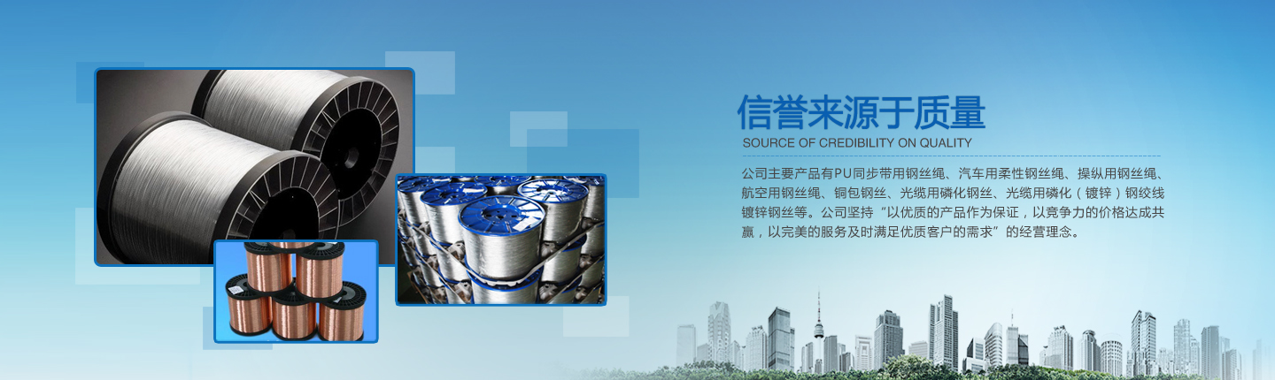 公司主要產(chǎn)品有PU同步帶用鋼絲繩、汽車用柔性鋼絲繩、操縱用鋼絲繩、航空用鋼絲繩、銅包鋼絲、光纜用磷化鋼絲、光纜用磷化(鍍鋅)鋼絞線、鍍鋅鋼絲等。經(jīng)過多年的研究、摸索、開發(fā),公司已形成了完整的技術(shù)、工藝軟件,產(chǎn)品實物質(zhì)量均達到國際先進水平。
